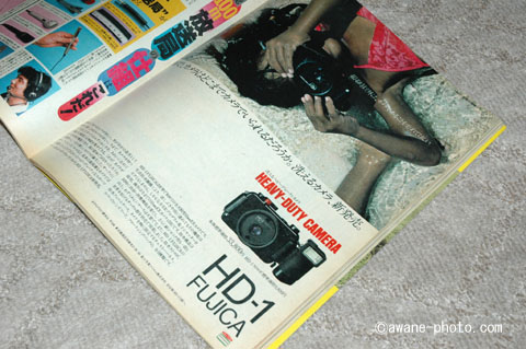 目次のつぎに,「キヤノンA-1」の大きな広告が出現。ページをめくっていくと,カナダでのアウトドア活動体験プログラムを紹介する記事があるなど,この雑誌の方向性のようなものが見えてくる。また,この当時の「POPEYE」の読者ならサーフィンくらいは必履修科目だろ!といわんばかりの雰囲気を感じたりもする。だから,まんなかあたりのページに,「HD-1フジカ」の広告があっても,別に驚くことはなかった。いや,むしろ,ごく自然なことに思われたのである。ちなみに,別のページでは,セイコーの「シルバーウェーブ」(防水タイプの腕時計)の広告があったりする。
