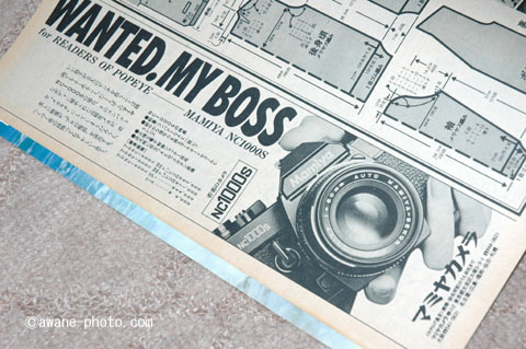 「HD-1フジカ」は,サーファー(陸サーファーも含むかも(^^))たちに強くアピールしたかったのかもしれない。さて,ページも終わりに近づいたころ,また,カメラの広告が出ているのに気がついた。それは,左端1/3ページ程度の比較的小さな広告であるが,私はそれに驚きを感じざるを得なかった。そこで宣伝されていたカメラは,「マミヤNC1000s」である。