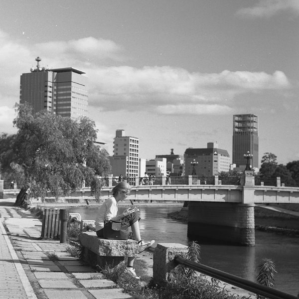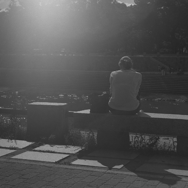 たとえば,ここでも本を読んでいる人はいる。ただ,ここでは木陰のベンチではなく,直射日光のあたるところで読んでいる。これは,私にはマネできないと思う。そんな人を,背後からこっそりとローライフレックスで撮ってみる。「逆光は勝利」という有名な格言?はよく知られているだろうが,ここでは逆光に負けてしまったようだ。この結果は想定外のものであるが,これはこれで,おもしろい絵になったのではないかと思っている。