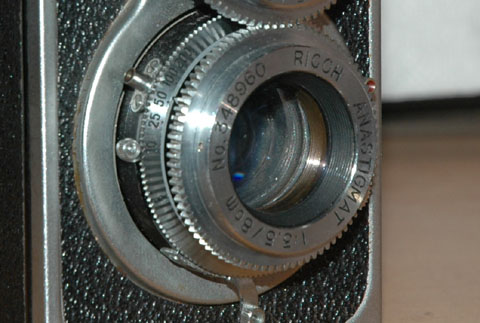 もう1つのリコーフレックスは,ネームプレートが失われているのだが,セルフタイマー付きで1/10秒〜1/200秒のリケン・シャッターが使われていることから,1955年に発売された「リコーフレックスVIIs型」(ケース付き8300円)と思われる。ところで,このカメラの巻き上げノブには,0から35までの数字が刻まれている。おそらくは,35mm判フィルムでの撮影ができる「リコー・キン」というオプション装置に対応しているのであろう。そうなると,「リコー・キン」も入手して,使ってみたくなるというものだ。