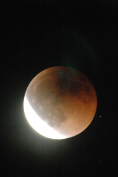 今回は,月食の最初からが見られるわけではなく,天気の期待もできなかったことから,とくに撮影の計画や準備はしていなかった。しかし,ほどよく赤銅色に輝く月を見ると,やはり撮りたくなってしまう。こういうときは,お手軽にディジタルカメラで撮影しておこう。
