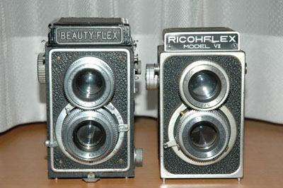 2007年09月01日(土) 天気:雨のち晴リコーフレックスVIIの清掃「リコーフレックスVIIs型」と同時にいただいた「リコーフレックスVII型」には,目立ったトラブルは見られない。ただし,ビューレンズにもテイクレンズにも,広くカビが見られるので,それを清掃する必要はありそうだ。 さて,「リコーフレックスVII型」「リコーフレックスVIIs型」は,たとえばローライフレックスなどほかの二眼レフカメラにくらべて,少しコンパクトに見える。画面サイズは同じ6×6判で,テイクレンズの焦点距離は8cmだから,カメラの横幅や奥行きは変わらないはずだ。なにが小さく見える要因かといえば,それは背が低いことである。たとえば,同じ廉価版前玉回転式二眼レフカメラ「ビューティフレックスV型」と並べてみよう。