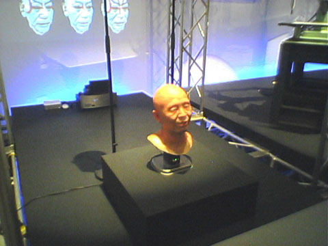 画像は,携帯電話のディジタルカメラ機能によるもの。「顔の表情」が「動く」ロボットである。皮膚の感じが,遠目にはリアルに見える。つまり,「生首」だ。それが動いているのだから, き も ち わ る い ・・・と感じる人も少なくないはずだ。そのせいか,ほかのロボットにくらべて,その前が比較的空いていたような気がする。空いていたのは,単に,いちばん奥に展示されていたからかもしれないが・・・・ 多数のロボットが展示されているフロアを出て上の階へ上がると,そこではHONDAの「ASIMO」のショーがおこなわれる。30分ごとにショーがおこなわれ,定員制,入れ替え制をとっているらしく,しばらくそこで足止めされる。 「大ロボット博」そのものを見ていたのは,1時間半くらいだっただろうか。そのあと「地球館」という展示施設を駆け足で見て,そろそろ疲れたなと外に出ると,すでに12時半を過ぎていた。「大ロボット博」への入場を待つ列はかなり伸びており,その列の先頭付近では「入場は40分待ちで〜す」と叫びながら,列が整理されていた。暑くもなく寒くもなく,空はいい天気で列のところは適度な木陰だ。ただ1つ,蚊が多いことを除いて,たいへん快適な場所なので,入場を待つのもさほど苦痛ではなかっただろう。いや,蚊が多いのは,かなり苦痛なことかもしれぬ・・・・。 |