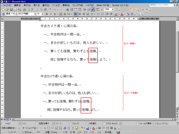 では,なぜその人は,「MS P明朝」を使っていたのか?聞くと,「Pはプロのことだと思っていた。プロフェッショナル用のフォントを使うほうがいいと思っていた。」とのこと。たしかに「P」は「プロ」だが,「プロポーショナル」の意味であり,「プロフェッショナル」の意味ではなかったのである。残念。