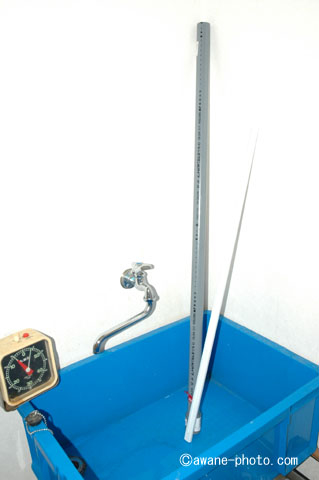 110フィルムの長さは,80cm弱。そこで配線カバーを約80cmに切断して,使うことにする。このように細長い状態では,ふだん使っている小型のタンクに入るはずがない。そこで,内側の直径25mm,長さ1mの塩ビ管(水道管)を現像タンクとして使うことにする。ホームセンターに行けば,両端の蓋をあわせても300〜400円くらいあれば買えるだろう。半径1.25cm,長さ100cmだから,なかに入る液の量は最大で,