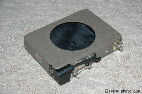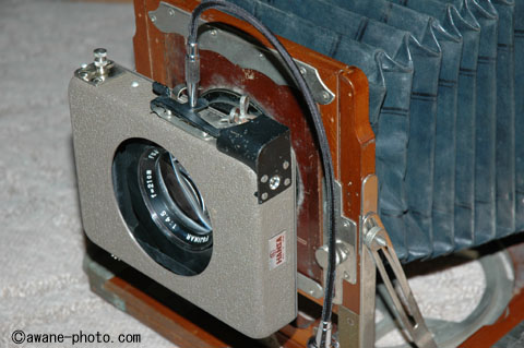 このレンズは,FUJINAR 21cm F4.5というものだ。見ての通り,このレンズにはシャッターもなければピントリングもない。ただ,絞りだけはある。このようなバレルレンズは,フォーカルプレンシャッターを内蔵した大判カメラで使うことができる。そして,フォーカルプレンシャッターを内蔵していない大判カメラで使うときには,このようなシャッターユニットを併用する。