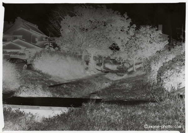 OKUHARA CAMERA, FUJINON W 210mm F5.6, F11 4sec, FUJIBRO WP FM2露光した印画紙を「コレクトール」で現像する。この画像は上から順に,ISO 6,ISO 1.5,ISO 0.4で露光したものである。「コレクトール」の標準的な現像時間は90秒とされているが,ISO 6相当で露光したものは,前回と同様に60秒で現像を打ち切った。ISO 1.5で露光したものは,像が出るのがさらに速く,現像を25秒で打ち切った。ISO 0.4で露光したものは,もう一瞬でまっくろ,という印象である。15秒ほど現像したことになるが,それでも長すぎたようだ。現像時間が短すぎると,現像を打ち切るタイミングがむずかしい。結果として,ISO 1.5相当のものがもっともトーンが出たようであるが,ISO 0.4のものは,現像を打ち切るタイミングを誤ったものとも考えられる。 さて,予備としてISO 3で露光した残りの1枚は,「コレクトール」ではなく,フィルム用現像液「スーパープロドール」(SPD)で処理をおこなうことにした。フィルム用現像液を使えば,印画紙用現像液よりも進行がゆっくりで,現像を打ち切るタイミングを見つけやすいことが期待できるからである。