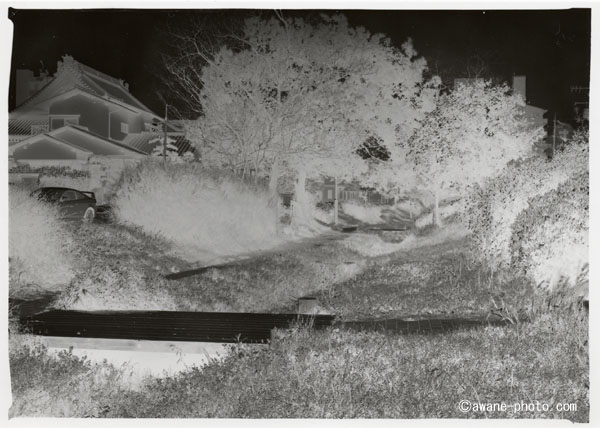 2010年04月29日(木) 天気:晴たっぷり露光 あっさり現像4×5判よりも大きなサイズのシートフィルムのラインアップは,かなり少なくなっている。また,価格も決して安いものではない。モノクロ用であっても,入手は容易ではないのだ。また,小型タンクが使えないので,現像も難易度が高い。 ところで,モノクロのネガをつくるときには,1つの定石とされる考え方がある。それは「たっぷり露光 あっさり現像」というものだ。黒くつぶれがちなシャドウ部のトーンを再現できるようにするには,撮影時に,シャドウ部を基準に露出を決めればよい。このとき,全体を平均的に測光した場合にくらべれば,ややオーバー目の露出となる。これが「たっぷり露光」の意味するところのようである。そしてその分だけ現像時間を短め,すなわち「あっさり現像」することで,適度な濃度のネガが得られるということだそうだ。たぶん,こういうことを言っているのだろうと解釈している。ただし,どれくらい「たっぷり露光」して,どれくらい「あっさり現像」すればよいのかの基準は,とくにない。あくまでも1つの考え方ということか。