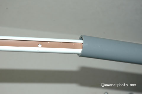 110フィルムの長さは,約70cmある。内側の幅が約17mmの配線カバーは,約80cmの長さに切り,ところどころ大きく穴をあけて現像液が十分にまわりこむようにしてある。ここに取りだした110フィルムをつっこんでいく。もちろん,暗室内での作業だ。