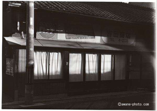 Korelle, Radionar 7.5cm F4.5, ACROS100 / EL-NIKKOR 75mm F4.5, ILFORD MGIV RCこの県道沿いには,営業中の鮮魚店もある。また,クリーニング店の看板が残っている建物もあるが,これはどうも廃業しているようだ。ほかにもショーウィンドウの跡のようなものがあって,なんらかのお店だったことをうかがわせるような建物もある。