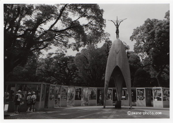 フィルムは,すなおにNEOPAN 100 ACROSである。天気もよいので,赤フィルタやオレンジフィルタをかけながら,とにかく36枚を撮りきってしまうようにした。平和記念資料館から原爆ドームへ向かう。「原爆死没者慰霊碑」の向こうに原爆ドームが見えるという「お約束」のカットを撮ろうと思うが,時節がら修学旅行と思われる団体さんが多く,人が途切れることがない。子どもたちを撮るつもりはないのだが,どうしても画面内に写りこんでしまう。しかたないので,正面から少しずれた位置で撮ってみる。それでもいろいろな人が写りこんでしまうのだが,これくらい離れているのだから,あくまでも風景の1つということで許していただこう。