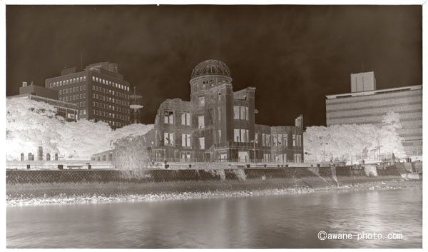 OKUHARA CAMERA, FUJINON W 210mm F5.6, FUJIBRO WP FM2まずは「原爆ドーム」を撮ってみる。このカメラでここから撮る理由は,レンガの1つ1つがちゃんと写っていることを確認するため。原版がすでに四切の半分のサイズなのだから,引き伸ばしをしなくても,ルーペなど使わなくても,川の向こうにあるレンガの1つ1つを楽に見ることができるのである。大きなフォーマットの魅力の1つである。