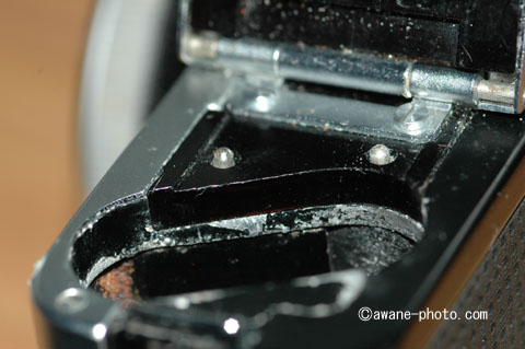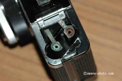つまり,2本の単3乾電池は,どちらも電池ボックスの蓋の側を「+」にして入れることになるようである。ということは,これらの電池は大きな電流を流すために並列で使われるのであろうか?それとも,電子シャッターと,巻き上げ・巻き戻しのモーターとは,別々の電池で動作することになるのだろうか?