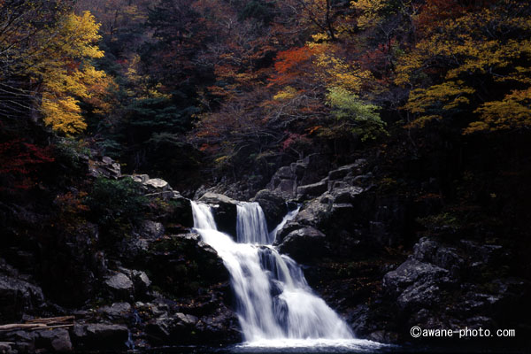 Mamiya Universal Press, Mamiya-sekor 50mm F6.3, E100VS三段滝が,ちゃんと三段に見える位置だから,当然ながらこの展望台から写真を撮る人が多いわけだ。一方,低いところから見るのも,滝と紅葉のバランスがよくて好きである。しかしながら,三段滝が三段に見えないのでは,あまり人気はないのかもしれぬ。