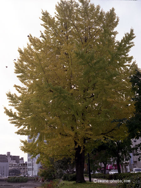 ZENZA BRONICA ETRS, ZENZANON E-II 75mm F2.8, REALA天満川と本川とがわかれるところ,別の見方をすれば楠木の大雁木の少し下流のところにも,気になる黄色いイチョウの木がある。