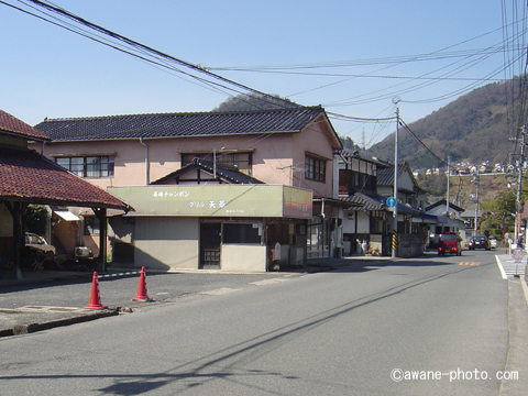 この画面中央に見える,緑色のテントの「グリル天草」のところから,河戸駅に入ることができる。