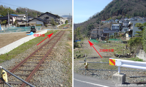 可部線が延伸されるのは,河戸駅のすこし先あたりまでとなる。現在,線路の跡は,可部線と県道とが交差するあたりを境に様相が異なる。そこより可部側はまだレールが残されているのに対し,三段峡側はすでにレールがきれいに撤去されている。ここから先,三段峡までの線路の跡は,道路の拡幅や自転車道,遊歩道の整備に使われるという。