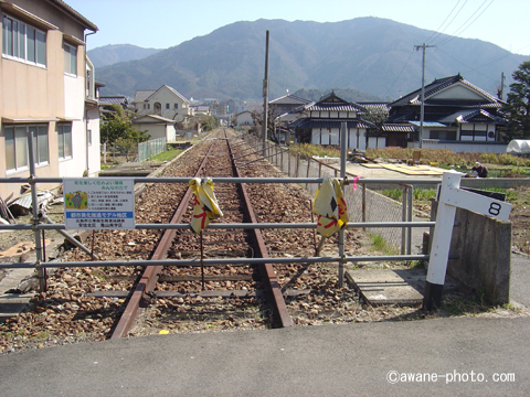 駅舎もなく,ホームにちょっとした待合所があるだけの簡素な駅だが,待合所に入れないように封鎖されているだけで,そのほかは驚くほどきれいに,現役当時と変わらぬ姿で残っている。「河戸駅まで電化早期実現」という看板もあり,地元の人たちによって維持・管理がなされているのだろう。