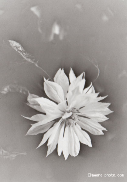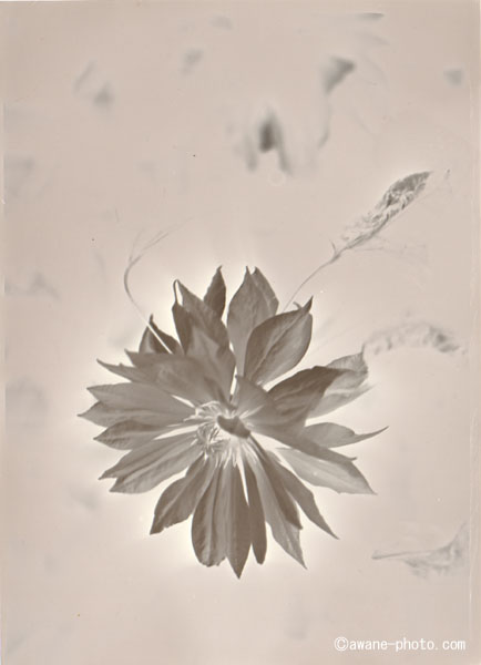 OKUHARA camera, FUJINON W 210mm F5.6, FUJIBRO WP FM2, FUJIBRO WP FM2同じ被写体で,ふつうの現像をおこなったものをつくらなかったので,ソラリゼーションの効果がよくわからない(笑)。これは,まあ,単純なミスというかなんというか。被写体は鉢植えのクレマチスなのだが,すでに花はしぼんでしまっている。剪定して,次の花が咲くのを待つことにしよう。 |