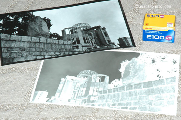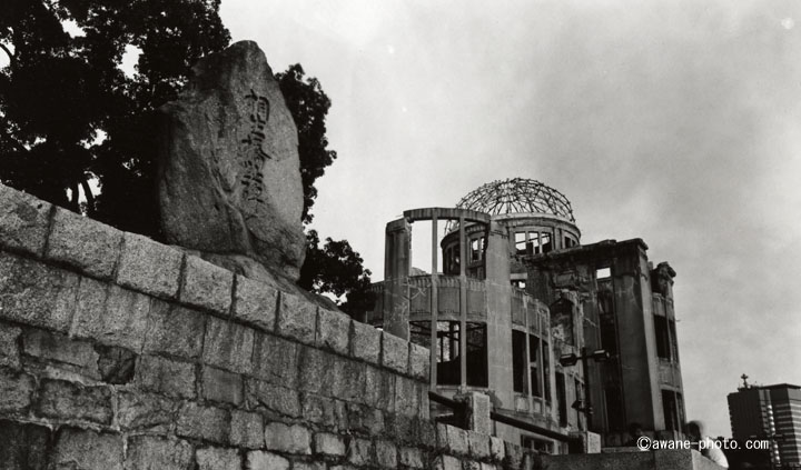 つぎはすこし場所を変えて,川へ降りる途中から見上げてみた。スイングアオリを使いたい場面であるが,古典的な組立暗箱ではフロントライズを除いてアオリ機構は用意されていない。とはいえ各部分に多少の「遊び」があるような組立暗箱なので,気持ちほどはアオリが可能である。これは「長所」というよりも,工作精度がいまひとつという「短所」なのかもしれないが(笑)。気持ちほどだがアオリを効かせ,さらに思いっきり絞りこむことで,手前の碑にも,奥の原爆ドームのレンガにも,だいだいピントがあって見えるようになった。