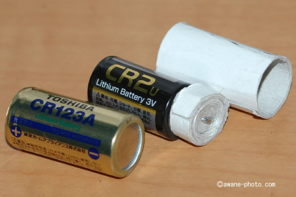 まず,CR2とCR123Aは,どちらも3Vのリチウム電池である。CR2とCR123Aとはほぼ同じ太さで,CR123Aのほうが少し長い。これは簡単な継ぎ足しを工夫すれば,簡単に兼用できることになる。ニコンの一眼レフカメラでは,CR2やCR123Aを使うものが多い。CR2とCR123Aとが兼用できるようになれば,電池を使いまわせる範囲が大きく広がる。