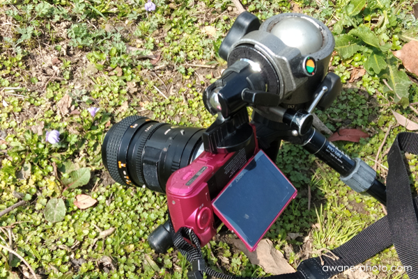 2個の自由雲台を使って,徹底的にローアングルにしている。