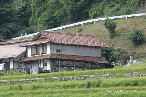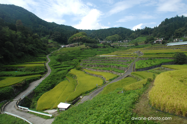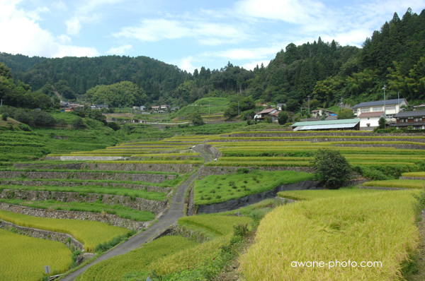 Nikon D2X, SIGMA AF 14mm F3.5例年であれば,ここでは9月前半に刈り入れがおこなわれる。だから訪れたときには,田でなにか作業をしているような人の姿は見られなかった。刈り入れはおそらく,来週か再来週くらいであろうか。そのころには,ここを見学に多くの人が訪れるだろうが,今日はほかに訪れる人を見かけることはなかった。おかげで,のんびりと風景を撮ることができる。田は全体に黄色っぽく,稲は順調に実っているようであるが,今年は作付けをしていないと思われる緑色の区画も目立っている。