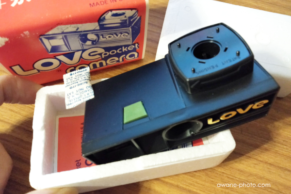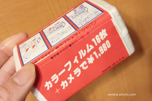 まず,そのパッケージを見てみよう。発泡スチロールのパッケージには,「LOVE POCKET CAMERA」という文字と,いかにもカメラらしいイラストが描かれている紙が巻かれている。この中身がカメラであることが,とてもわかりやすいものになっている。だからこそ,ジャンク品のなかからすぐに,見慣れないカメラがあると認識できたのである。パッケージにはさらにいろいろな情報が含まれており,目立つものとしては「カラーフィルム16枚+カメラで¥1,980」という文字が記されている。また,「MADE IN U.S.A.」という表示があり,輸入発売元として「(株)ラブカメラ・ジャパン」という名称が記されている。日本やドイツなどの,なじみのあるメーカーの製品ではなさそうである。また,アメリカの製品のようだが,コダックが直接に発売しているようなものでもないようだ。